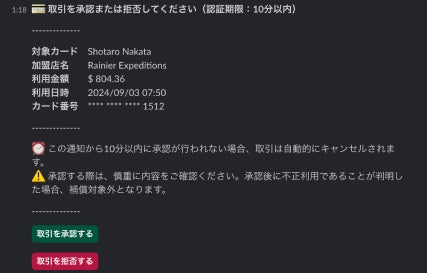 - 決済カードの保有者ユーザーのSlack ダイレクトメッセージへ、認証通知が送信されます。