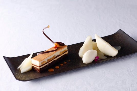 ◆『カフェ・キャラメルと山形県産ラ・フランスのガトー・オペラ仕立て ラ・フランスのフレッシュとコンポート、ソルベをあしらって』 2,700円