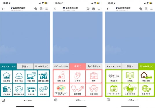 画面下部に固定されている「メインメニュー」「子育て」「町のみりょく」の3つのリッチメニューから、各種情報が掲載されているWebサイトに遷移することができます。従来はホームページを検索し、該当ページにアクセスすることで得ることができた情報ですが、今後はLINEのトーク画面から手軽に情報源にたどり着くことができます。