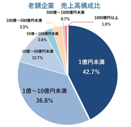 - 売上高別では42.7%が「1億円未満」、一方で全国の1000億円企業のうち老舗は20.8%を占める