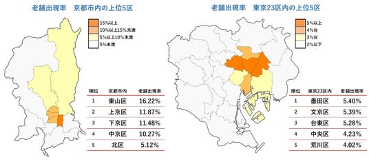 老舗出現率が最も高い京都府内で、より老舗が集中している京都市内を細かくみると、料亭を中心に食品関連が多い東山区(16.22%)が群を抜いたトップで、4区が10%を上回った。また、社数として最も多い東京都の23区別では、墨田区(5.40%)が最も高かった。中央区では設立5年未満企業の割合も高いことから、新興・老舗企業がそれぞれ多く集まっている特色がみられる。
