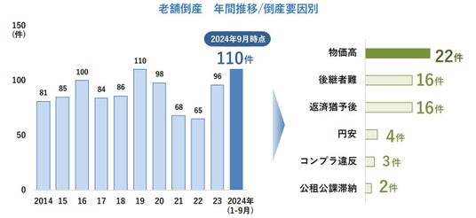 財務指標分析では老舗企業特有の結果がみられ、長年にわたって蓄積された資産による財務の収益性・安定性が老舗企業の強みとして確認された。しかし、2024年9月時点における老舗企業の倒産は110件を数え、既に過去10年間でも最も多かった2019年に並び高水準で推移している。そのうち、相次ぐ値上げの波に追いつけなかった物価高倒産(22件)や後継者不在による倒産(16件)、金融機関から返済条件の変更(リスケジュール)を受けながらも経営改善が図れなかった返済猶予後倒産(16件)など、近年高まっている倒産要因も多く含まれていることがわかる。さらに円安、コンプライアンス違反、公租公課滞納などを要因とする倒産も複数確認された。