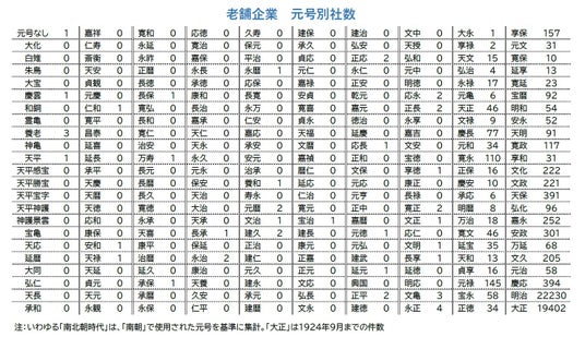 元号別の社数は以下の通り。前述の金剛組は578年創業で、元号が制定された645年(大化元年)以前であるため、唯一「元号なし」としている。現代に近く、元号あたりの期間が長い場合に社数が増えるなかで、「一世一元の制」が導入された以降の明治・大正に9割近くが集中した。