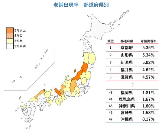 全企業数に占める老舗企業の割合を指す「老舗出現率」を都道府県別でみると、京都府が5.35%で最も高かった。商業の中心地ではなかったものの、倹約・勤勉などの精神が根付く京都府における老舗の存在感は今でも強い。なお、府内で最も多かった業種は呉服文化が色濃く残る織物卸売業で、旅館、造園、製茶業など和物系の業種が上位だった。なお、社数としては東京都が5301社で最も多かったものの、老舗出現率においては2.24%で38位だった。