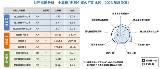 長い業歴を誇る老舗企業は安泰のイメージを持たれることから、財務基盤も盤石という見られ方をされることも多い。そこで、収益性・安定性・効率性の観点から、2023年度決算における全業種(約30万社)と老舗企業(約1万社)それぞれで、財務比率指標の平均を比較した。