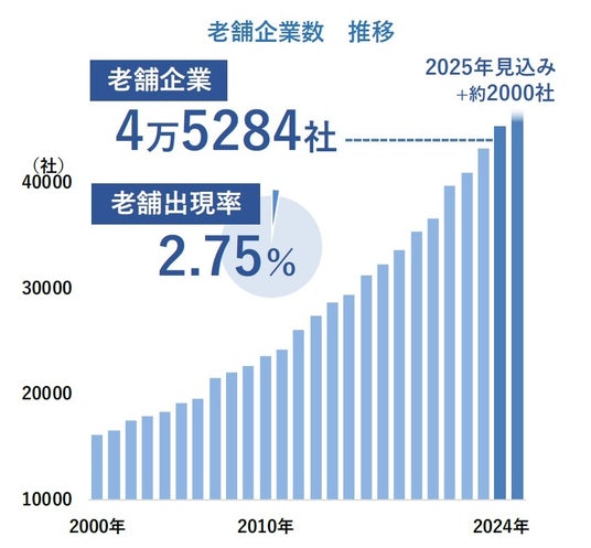 2024年9月時点で、業歴100年以上を有する老舗企業は4万5284社にのぼる。関東大震災が発災した翌年となった1924年に創業してから長く事業を続け、今年老舗企業の仲間入りを果たした企業は、全国で約2000社を数えた。また、全国における老舗企業の割合を指す「老舗出現率」は2.75%だった。現時点では、2025年も同水準の企業が100周年を迎えると見込まれる。