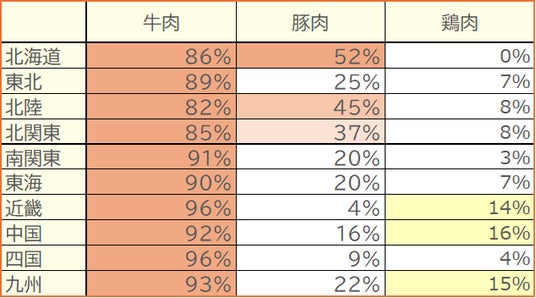 北海道では豚肉を食べると回答した人が約52%。北陸や北関東でも豚肉がよく食べられていることがわかりました。