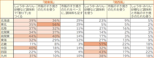 「関東風」で割り下をつくる人は、近畿、四国を除き、全国的に3割を超えました。「関東風」で市販のすき焼きのたれを使う人は、関東より東側の地域に多く、一方で「関西風」でつくる人は近畿より西側の地域に多くいました。東海地方が「関東風」「関西風」のゆるやかな境目と言えそうです。