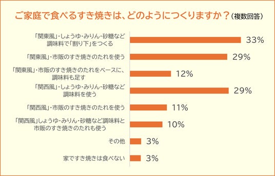 ご家庭ですき焼きをつくる時、「調味料で割り下をつくる」「市販のすき焼きのたれを使う」「しょうゆ・みりん・砂糖などの調味料を使って調理する」と意見が分かれました。