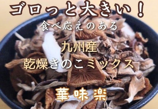 他社では粉になって食べにくいため、華味楽の乾燥きのこはゴロっと大きい食べ応えのあるきのこを厳選しました。4種類のきのこ、平茸、椎茸、なめこ、舞茸をブレンドしました。