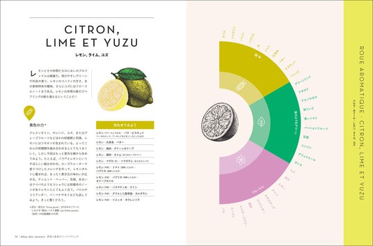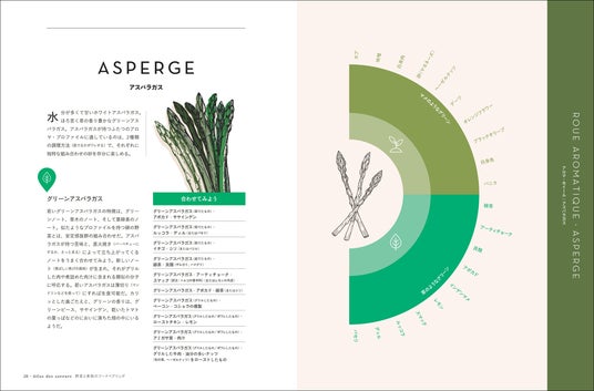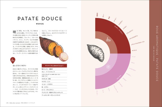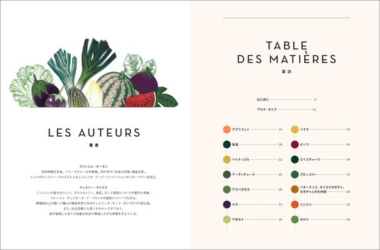 はじめに/アロマ・タイプ/アプリコット/海藻/パイナップル/アーティチョーク/アスパラガス/ナス/アボカド/バナナ/ビーツ/スイスチャード/ブロッコリー/バターナッツ、セイヨウカボチャ、カボチャとその仲間/ニンジン/セロリ/サクランボ/キノコ類/クリ(シャテーニュとマロン)/キャベツ、カリフラワー、芽キャベツ/レモン、ライム、ユズ/マルメロ/キュウリ/ズッキーニ/チコリ/ホウレンソウ/フェンネル/イチジク/イチゴ/ラズベリー/パッションフルーツ/ザクロ/スグリ/サヤインゲン/キウイ/穀類・豆類/ライチ/トウモロコシ/マンゴー/メロン/キイチゴとカシス/ブルーベリー/カブとダイコン/ネクタリンとブリュニョン/ココナッツ/オレンジ、マンダリン、クレメンタイン(オレンジとミカンの交配種)/スイバ/グレープフルーツ/パースニップ/パパイヤ/スイカ/サツマイモ/モモ/グリーンピース、ソラマメ、エダマメ/洋ナシ/ポロネギ/パプリカ/リンゴ/ジャガイモ/プラム/ブドウ/ルバーブ/サラダ用葉菜/大豆と豆腐/トマト/註と参考文献/食材の組み合わせ一覧