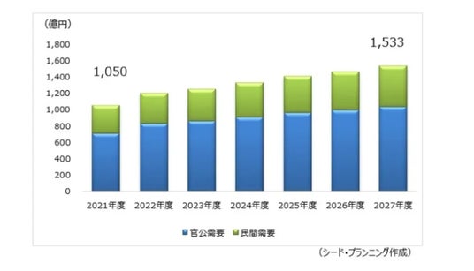 国内防災関連市場は成長の一途をたどっており、防災に関連する情報システム・サービス市場は調査会社のシードプランニングによると、2021年は1050億円となっています。以降は増加トレンドとなっており、2027年には1533億円となることが予想されています。年平均で6.5%の伸び率となっています。