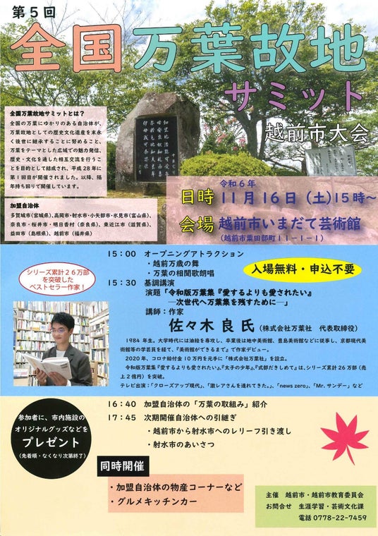 サミットでは、越前万歳や万葉の相聞歌朗唱が披露されるほか、令和版万葉集『愛するよりも愛されたい』などシリーズ累計26万部のベストセラー作家の佐々木良氏の講演会、加盟自治体による万葉の取組の紹介、加盟自治体の特産品などの販売を行います。入場無料、申込不要です。