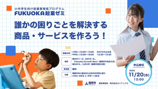 小中学生を対象にした起業家育成プログラムを運営する株式会社ガイアックス(本社:東京都千代田区、代表執行役社長:上田 祐司、証券コード:3775、以下 ガイアックス)は、福岡市より「小中学生向け起業家育成プログラム(以下、本プログラム)」における運営業務を受託しました。