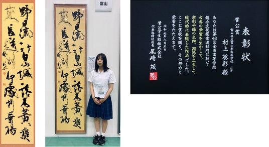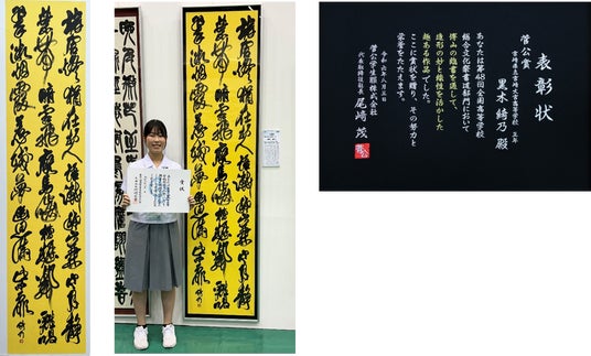 菅公学生服株式会社 (本社:岡山市北区駅元町、代表取締役社長:尾崎 茂 以下:カンコー学生服)は、 第48回全国高等学校総合文化祭(清流の国ぎふ総文2024)(以下、総文祭)書道部門において菅公賞に選ばれた5名に、制服生地に文字を刺繍で表現した賞状を10月より順次贈呈し、受賞者からの喜びのコメントが届きましたのでお知らせいたします。