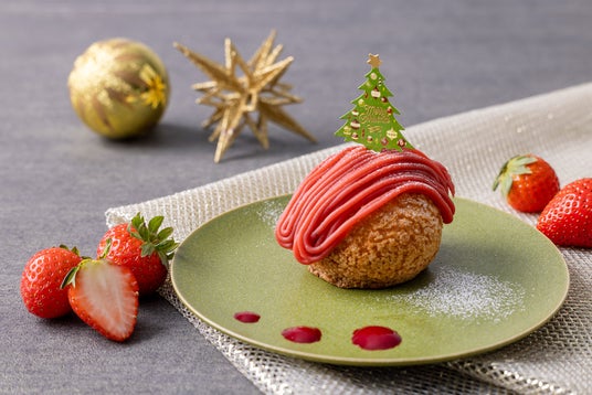 クリスピーなクッキーシューに、カスタードクリームをその場で詰めた出来立てのシュークリーム。上にストロベリーフレーバーのモンブランクリームを絞った、かわいらしいスイーツです。