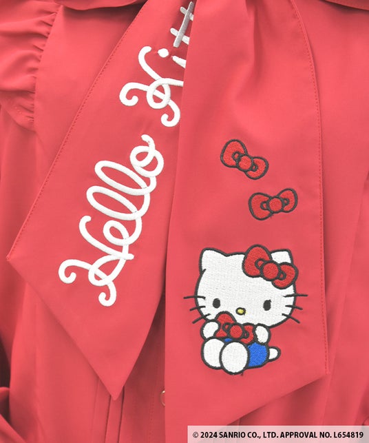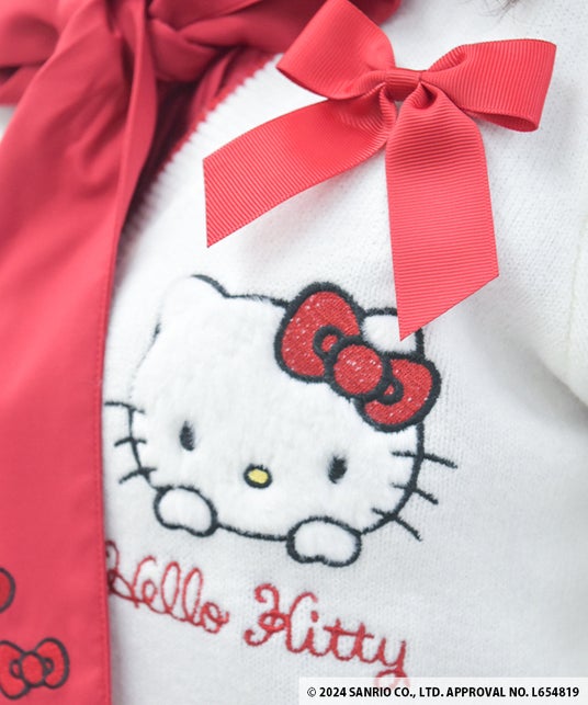 ビッグリボンの先にはリボンとたわむれるハローキティ(ハート)アイコンの赤いリボン、ロゴと刺繍でかわいらしくあしらいました。