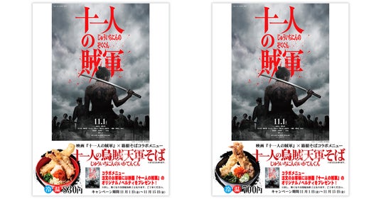 株式会社小田急レストランシステム(本社:東京都渋谷区 代表取締役社長:深海尚)は、2024年11月1日(金)から11月15日(金)まで、『箱根そば本陣』および『箱根そば』全店にて、映画『十一人の賊軍』とコラボレーションした期間限定メニュー『十一人の烏賊天軍そば』を販売いたします。コラボメニューをご注文いただいたお客様には、映画『十一人の賊軍』ビジュアルフォトカードを1枚プレゼントいたします。ぜひご利用ください。