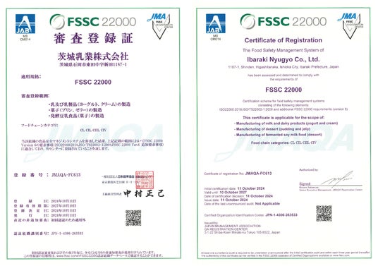 株式会社JFLAホールディングス(本社:東京都中央区、代表取締役社長:檜垣周作)のグループ会社である茨城乳業株式会社(本社:茨城県石岡市、代表取締役社長:中沢新一)は、2024年10月11日に食品安全マネジメントシステムの国際規格「FSSC 22000 (バージョン6.0)」の認証を取得しました(審査登録機関:一般社団法人日本能率協会)。茨城乳業で製造する全製品、全部署が対象になります。