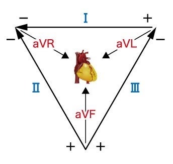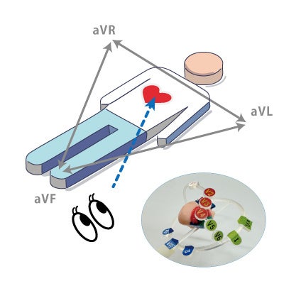 心電図として観測される波形の種類は、「この波形は右肩から心臓を見た時のものである」といったように、心臓をどの方向から見ているかによって分かれています。12誘導心電図では12種類の波形が観測されるため、12パターンの方向から心臓を見ています。どの方向から心臓を観察するかはアイントーベンの三角形(左図)のような簡略図を用います。しかし簡略図は平面であるため、見る方向と心臓のかたちとの関係を三次元的に理解しにくいという課題がありました。