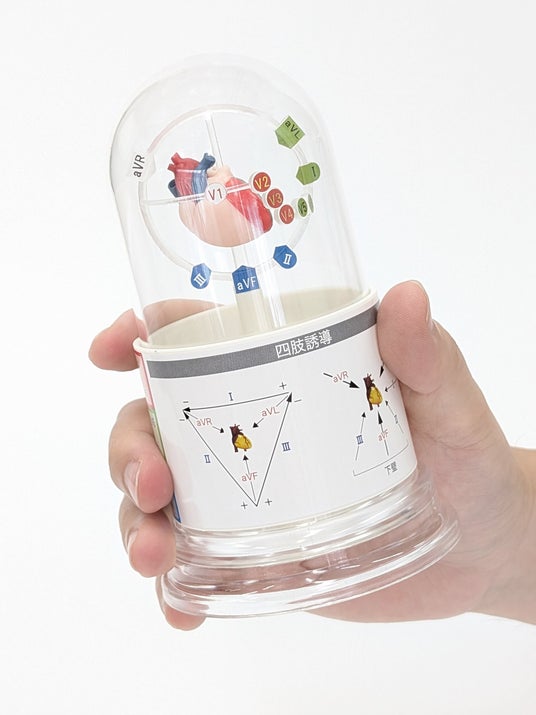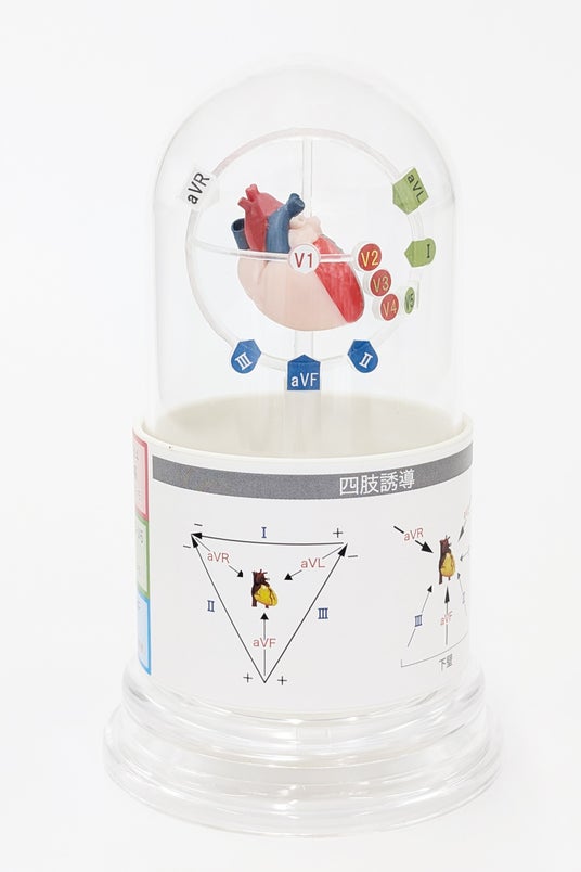 - ドームケースに各心臓部位と電気信号の流れる方向を配置、外側のリングシールには12誘導心電図の簡略図が記載されており、三次元的に学習できる。