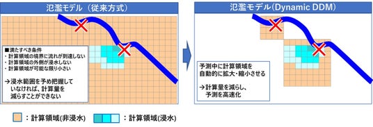 本システムの予測のリアルタイム実行には、日立の特許技術Dynamic DDM*8を適用しており、浸水領域の広がりに応じて計算領域を自動的に拡大・縮小させることで計算量を減らし、予測の高速化を実現しています。
