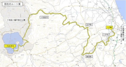 環境省、青森県、八戸市、南部町、五戸町、十和田市では、十和田八幡平国立公園と三陸復興国立公園・みちのく潮風トレイルとを結ぶ新たなロングトレイルとして、青森県八戸市から南部町、五戸町を通り、十和田市の十和田神社まで、約120kmの「八戸十和田トレイル(仮称)」を設定する取組を進めています。