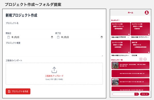 工程表データをアップロードし連動させることで、現場で撮影した写真の属するプロジェクトを推測。該当プロジェクトに必要なフォルダを自動生成してくれます。保存先もAIが提案してくれるので、今までかかっていた整理の手間が省け、ワンタッチでの写真保存・管理が可能に。