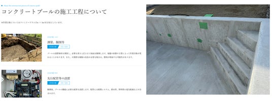 サイトではコンクリートプールの特徴のほか、施工工程についても詳しくご説明しています。