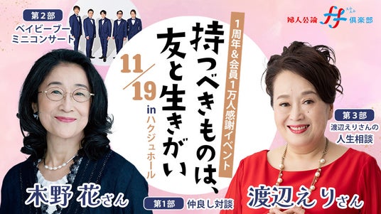 雑誌『婦人公論』の読者会員組織「婦人公論ff俱楽部」発足1周年&会員登録1万人に感謝して、『婦人公論』読者に人気の、渡辺えりさんと木野花さんによるトークショーを開催。美しいコーラスが魅力のアカペラグループ・ベイビーブーによるミニコンサートなど充実のプログラムでお届けします。ぜひお申し込みください。