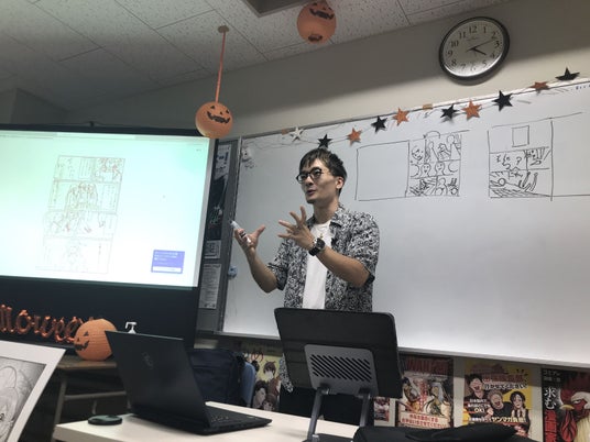 作品の演出、コマ割り、構図、構成について何を加えると読みやすくなるのかを学生と一緒に考え、ホワイトボードを使用してリアルタイムで作品添削を行いました。
