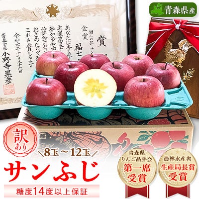 青森県りんご品評会にて3年連続青森市長賞、令和3年度青森県りんご品評会にて第一席を受賞した人気のりんご。「サンふじ」は、甘み・酸味・歯ごたえの三拍子が揃った人気の品種です。りんごにはツル割れ・色むら・枝傷・サビ・変形・形不揃いなどが見られるため、「訳あり」のお礼品として提供します。