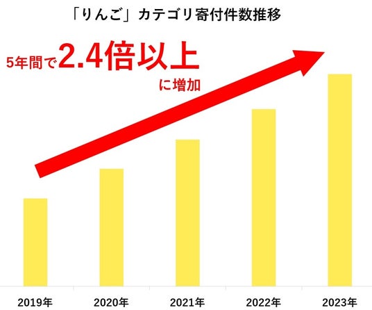 「さとふる」における「りんご」カテゴリお礼品への寄付件数は、2019年から2023年にかけて2.4倍以上に増えており、年々増加傾向にあります。さらに、2024年の1月から9月までのお礼品の登録件数も、2023年の同期間と比較して(※)1.6倍以上に増加しており、選べるお礼品の幅が広がったことで今後さらなる寄付増加が期待されます。