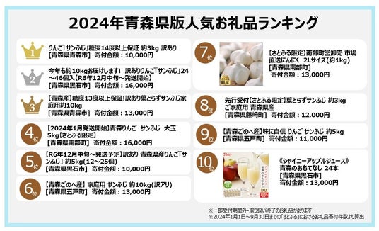 全てのお礼品カテゴリを対象とした2024年1月から9月までの青森県版の人気お礼品ランキングでは、1位~6位までを「りんご」のお礼品が独占。さらに、7位以外のすべてが「りんご」に関するお礼品でした。7位にランクインしたにんにくも、りんごと同じく青森県が国内生産量1位(※)であることから知名度が高く、青森県のお礼品として多く選ばれています。