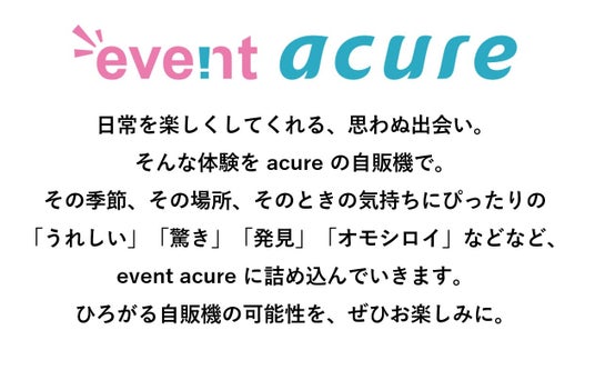 ■「event acure<イベントアキュア>」とは「イベントアキュア」は、季節やイベントに合わせてコンセプトを設定し様々な商品を展開していく百貨店の催事のようなものから、コンビニのレジ横のような話題の商品を取りそろえる、新しい形の自販機ビジネスです。飲料だけにとどまらず、さまざまな商品を販売しています。詳細はこちら:https://www.acure-fun.net/acure/#anc03