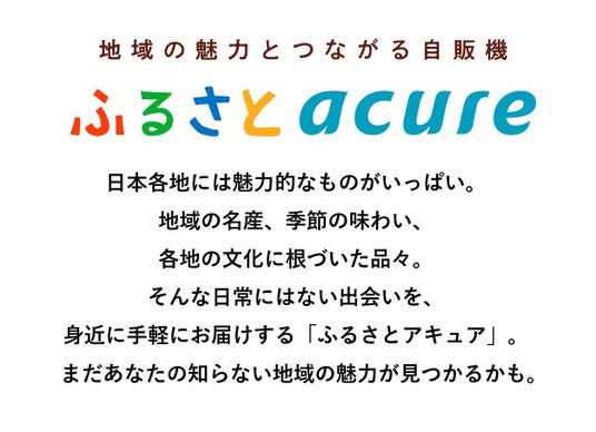 ■<地域の魅力とつながる自販機 『ふるさとアキュア』>とはアキュアの自販機業態の1つ「イベントアキュア」から、この度、 『ふるさとアキュア』が誕生します。 『ふるさとアキュア』では、日本各地の魅力を気軽にエキナカ自販機を通じてお届けしていきます。