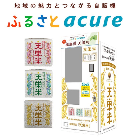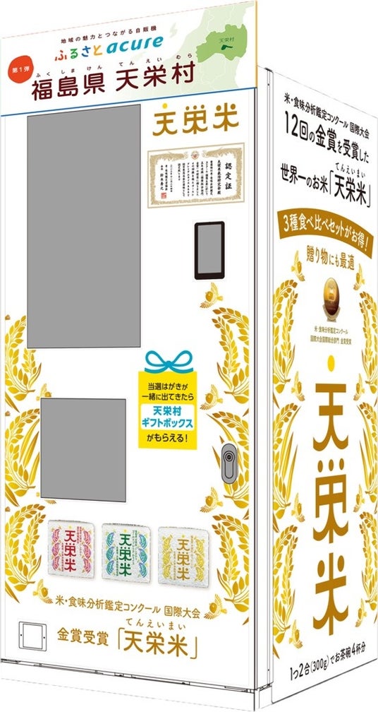 大宮駅の地域の魅力とつながる自販機 『ふるさとアキュア』で、「天栄米」をご購入いただいた方の中から抽選で「天栄村ギフトボックス(1万円相当)」が当たるキャンペーンを実施します。自販機で購入していただいた際に「当選案内及びはがき」が貼ってある商品が出てきたら、景品がもらえます。(※当選はがきに必要事項を記入し後日発送)