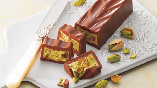 香ばしくコク豊かなピスタチオクリームに、深煎りしたピスタチオと塩がけしたピスタチオの2種類を混ぜ込んで、まろやかなミルクチョコレートに閉じ込めました。 切り分けると、なめらかなピスタチオクリームとたっぷり入ったピスタチオが表情豊かに顔をのぞかせます。 好きな厚さに切り分けて食べるスタイルが楽しいチョコレートです。