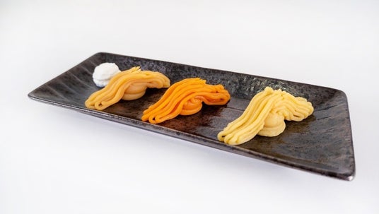 絞りたての滑らかな口溶けが味わえる!自然豊かな四万十川流域で育ったサツマイモ3品種を食べ比べできる会場限定のイートインセット。上段と下段で絞り方を変えたモンブランは、見た目がかわいいだけでなく、口溶けの違いでそれぞれの品種の個性が感じられます。