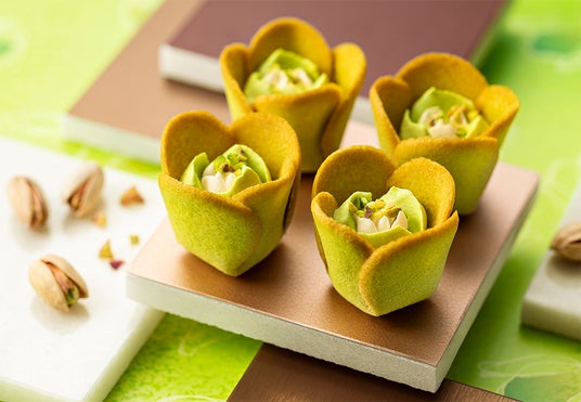 香ばしく芳醇な香り。ピスタチオカラーで焼き上げたチューリップラングドシャの中には、「ピスタチオ&ミルクのショコラクリームローズ」を咲かせました。ナッティなピスタチオの魅力を、クリーミーなミルクのコクとともに味わう“ピスタチオの花園”です。