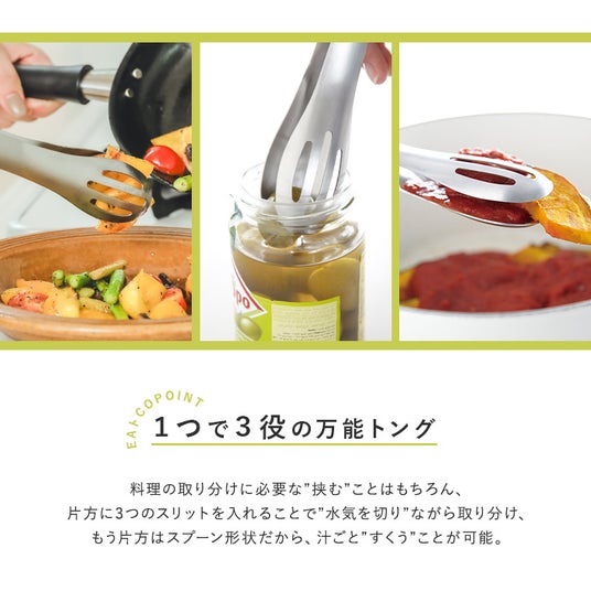 具だくさんのスープやソースの多い料理を取り分けるときに、おたまではスープばかり取れ、普通のトングは具材しか取れず、バランスよく盛り付けられない。そんなお悩みを解決するトングで、お手入れも簡単なアイテムです。