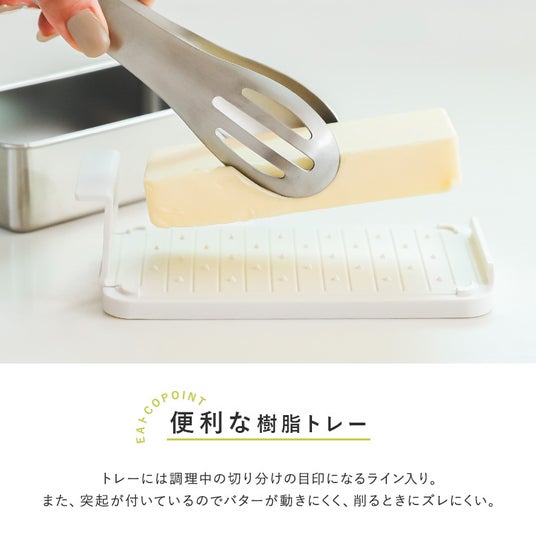 耐食性に優れた18-8ステンレス製のフタと樹脂トレーを組み合わせ、容器の密閉性を高めバターの乾燥を防ぎ、臭いも付きにくく、清潔に使えます。