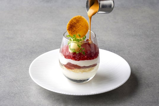 デザートメニューは、旬のリンゴを使用した「赤ワインでコンポートした福島県産リンゴとフロマージュブランムース」をご用意します。ほのかな酸味とキャラメルソースの程良いコクが特徴の味わい豊かなデザートです。