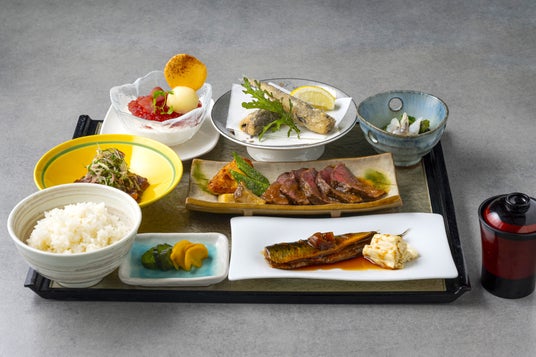 福島牛ステーキ/福島県産メヒカリの酢の物/福島県産「あおさ」の味噌汁