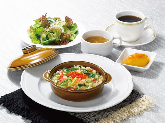 バター香るピラフに、たらば蟹*、国産の紅ずわい蟹、九条ネギを合わせ、いくら*と大葉をトッピングしました。紙鍋の牡蠣、海老*と帆立のあつあつグリルは、バターのコクと醤油やにんにくの香りが絡み海鮮の旨味を引き出しています。多彩な海鮮を、ピラフとあつあつグリルの2種の味わいで楽しめるフェア限定のメニューです。