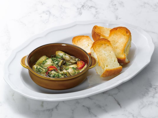 牡蠣ときのこ、トマトをガーリックオイルで煮込みました。ワインやソフトドリンクのサイドディッシュとしてもおすすめです。オイルはたっぷりとパンにつけてお召し上がりください。