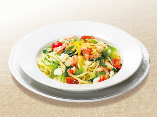 たらば蟹*と国産紅ずわい蟹に九条ネギを合わせた、オイルベースのスパゲティ。トッピングの爽やかなゆずやトマト、ピリッとした辛味の七味唐辛子がアクセントになり、食べ飽きることなくお召し上がりいただけます。