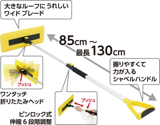 ヘッド幅41cm!広いルーフでも活躍するワイドブレード 広いルーフでもさっと雪下ろしができる幅41cmのワイドブレード。素材には適度な硬さと柔軟性のある発泡スポンジを使用。車を傷つけずに雪下ろしができます。ヘッド部分はワンタッチで折り畳めるので収納にも便利です。本体の長さは85cm~130cmまで伸縮でき、伸縮部分をピンロック式とすることで、重たい雪でも外れることがありません。
