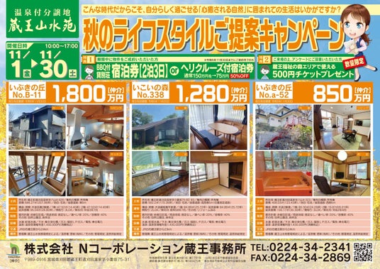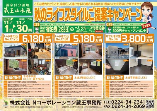 「蔵王山水苑」を運営する株式会社Nコーポレーションと、「稼ぐ別荘 ガイアリゾート」を運営する株式会社ガイアが、2024年11月1日より新築建売・中古物件販売キャンペーンを開催する。