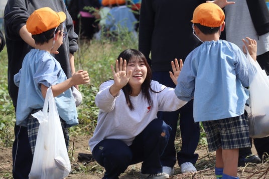 この特別授業に参加した学生は「子どもたちが土を掘って芋を見つけた瞬間の喜びを一緒に分かち合うことができました。自然体験は保育の中で大切な要素だと感じました」と、振り返ります。芋掘り体験を通じたやりとりから、子どもたちの成長を支える保育士としての実践力を養うことができました。